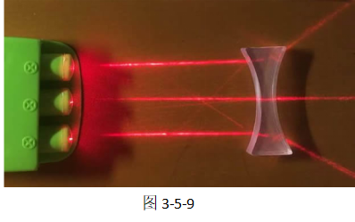 我们再做一个实验,如图3-5-9所示,当入射光平行于主光轴,通过凹透镜后,它们传播方向远离主光轴,但它们折射光线的反向延长线会交于一点,而且交点在主光轴上。